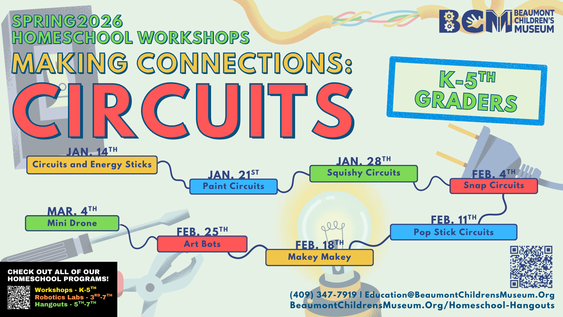 The Beaumont Children's Museum has homeschool programs available for families who want to supplement their science, technology, engineering, art, and math curriculum. Our workshops are tailored to K - 2nd and 3rd - 5th grade. These workshops include hands-on experiments and activities, social interaction with other students, and a fun way to bring to life what they are working on at home with you. We hope you can join us for S.T.E.A.M.-based lessons to help foster your kid's curiosity and discovery in support of what you are learning at home.